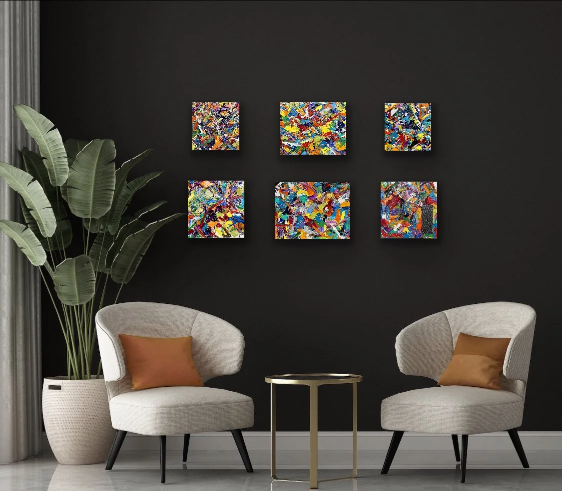 When I am lucky enough to be commissioned to create something for someone, the first question I ask is “what colors did you have in mind”? Often people ask me how I come up with ideas for paintings the answer being “whatever colors are in my mind”. Sometimes when I am done painting a piece, I ask myself “what was on my mind”? Do you see where I am going here…a new series of smaller 3-Dimensional Oil and mixed media works. These first 6 are maquettes created for a larger project which will include some different elements in the painting that I needed to sample on a smaller scale. Once the maquette was photographed, the element was removed so I could create each finished piece.